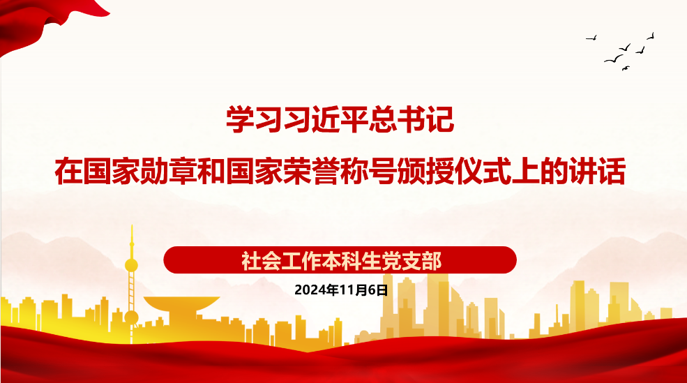 为深刻学习领悟习近平总书记重要讲话精神,11月6日,社会工作本科生党支部在学院6107会议室开展了“学习习近平总书记在国家勋章和国家荣誉称号颁授仪式上的讲话”的专题学习活动,支部成员艾力飞热提江和李正鑫同志担任领学人。
