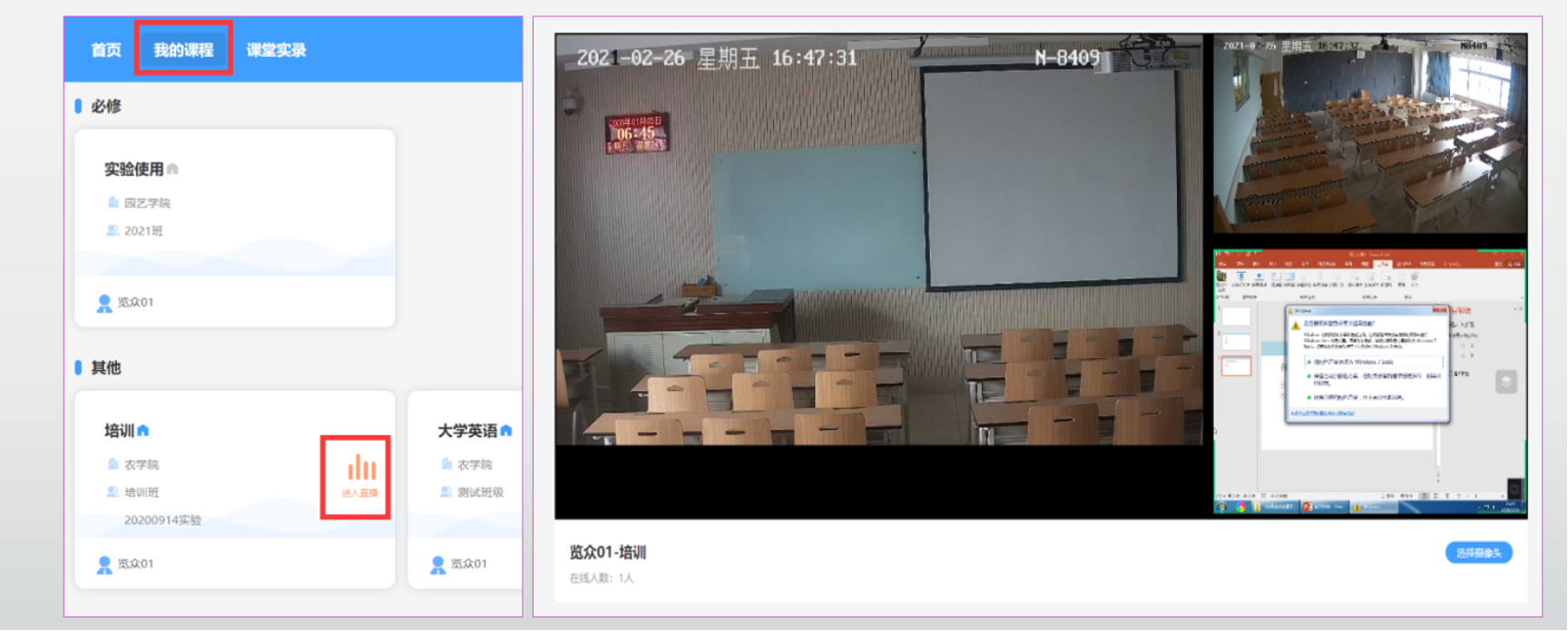 3、点击【我的课程】,在正在直播的课程卡片上点击【进入直播】按钮进入直播页面。