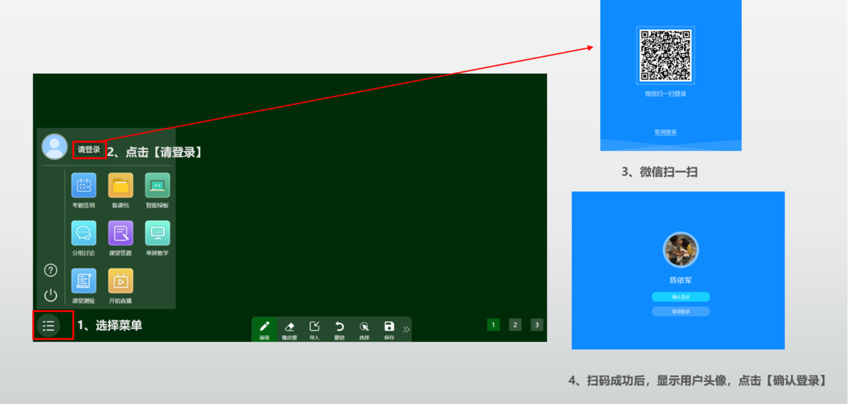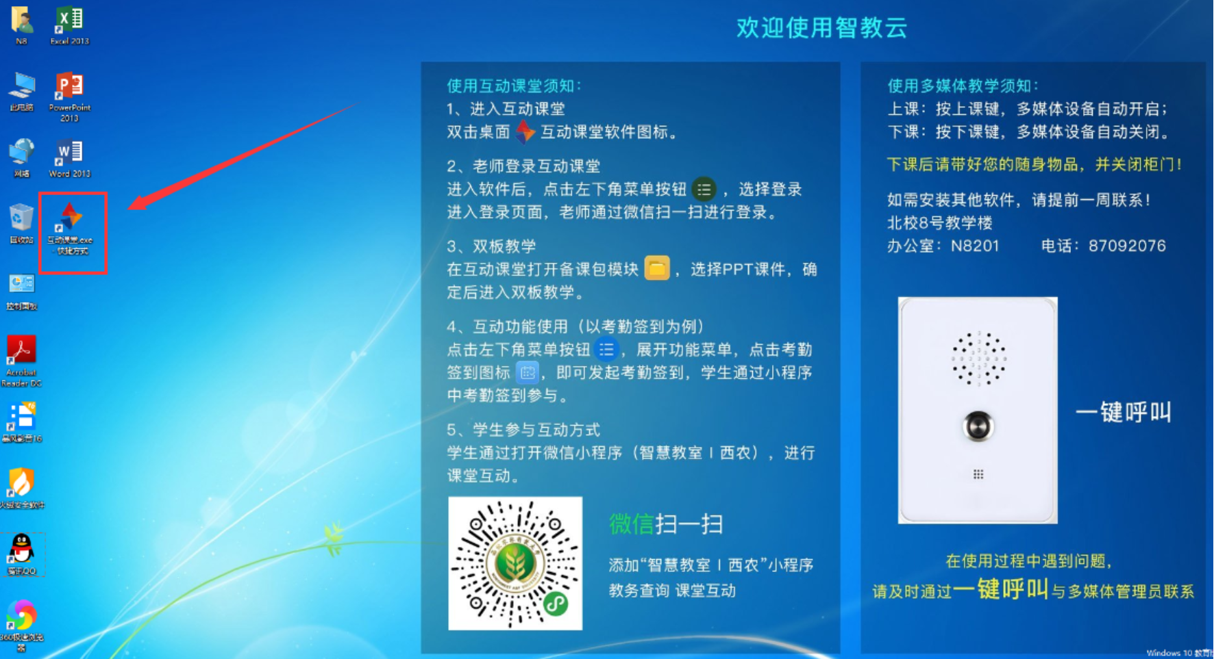 1、教师进入多媒体教室,点击面板中的【上课】按钮,打开教室设备。 (如遇设备问题,在教室中找到【一键呼叫】按钮,联系现场工作人员。)