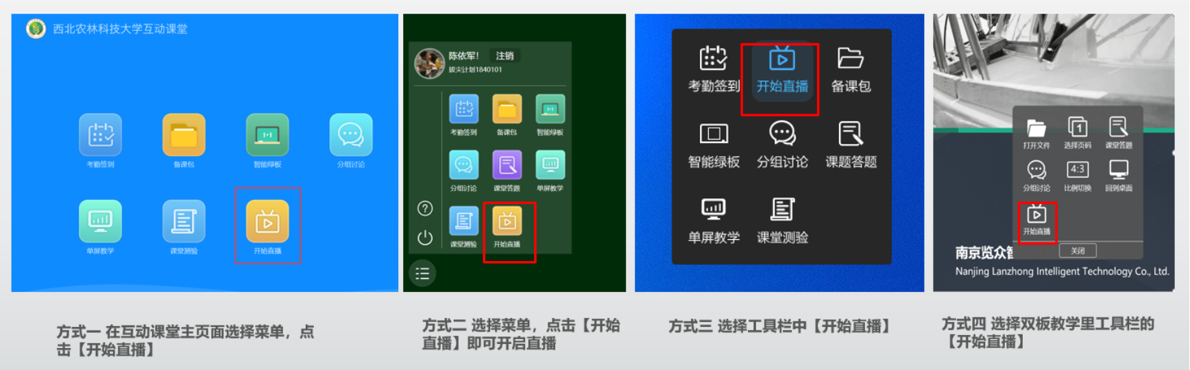 5、教师点击【开始直播】按钮,进行直播教学。学生可以通过【微信小程序】或【云课堂】进行直播观看和互动。教师可在以下方式中任选一种。