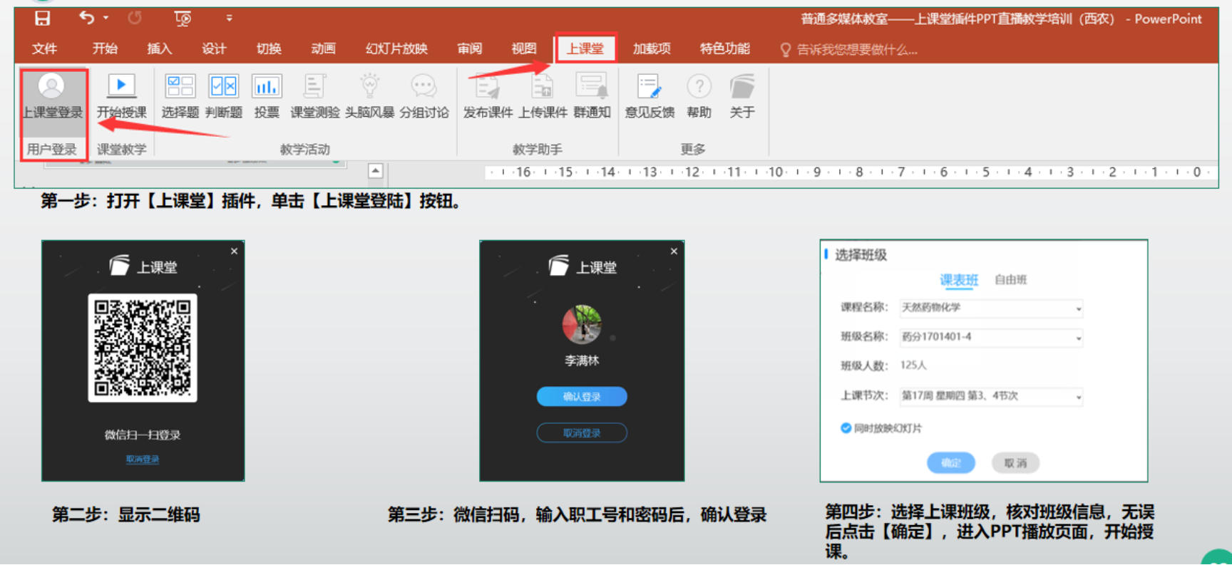 2、教师打开PPT并登录【上课堂】插件,登录成功后,点击【开始授课】,进入【选择班级】页面,课表班核对信息后点击【确定】。