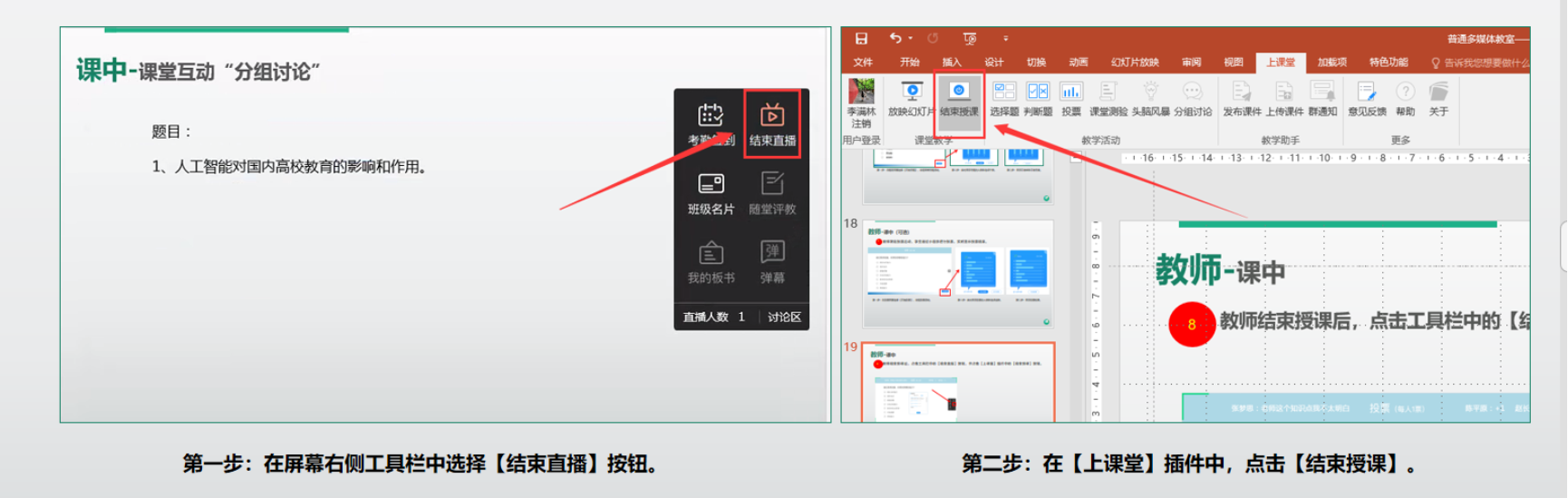 4、授课结束后,在屏幕右侧工具栏中点击【结束直播】按钮,并【结束授课】。