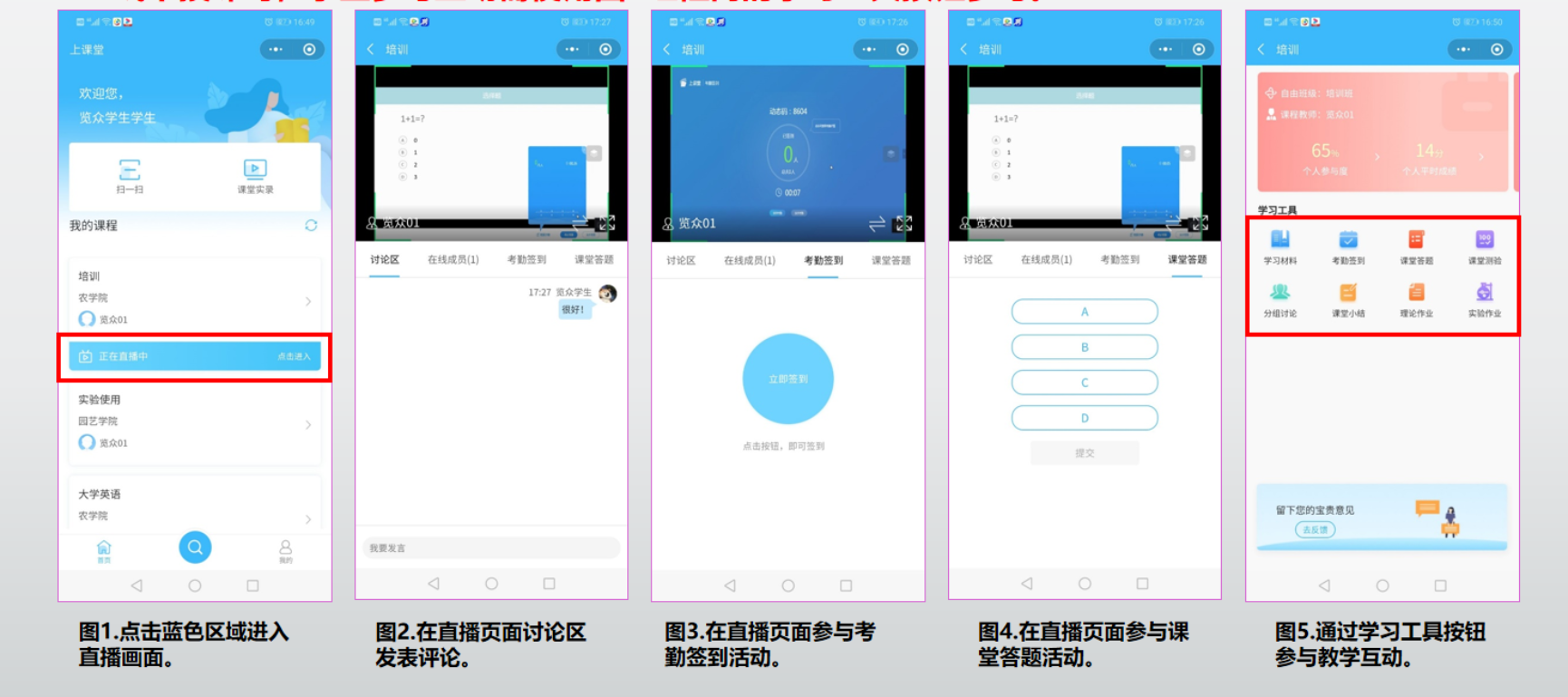 2、在个人主页点击【正在直播中】,进入课程并观看直播,系统支持在直播过程中发表评论、考勤签到、课堂答题互动,并参与教学互动。