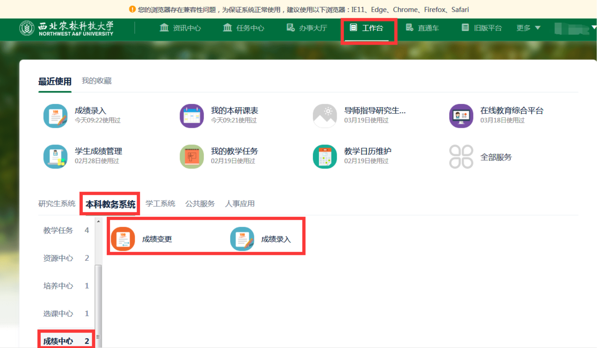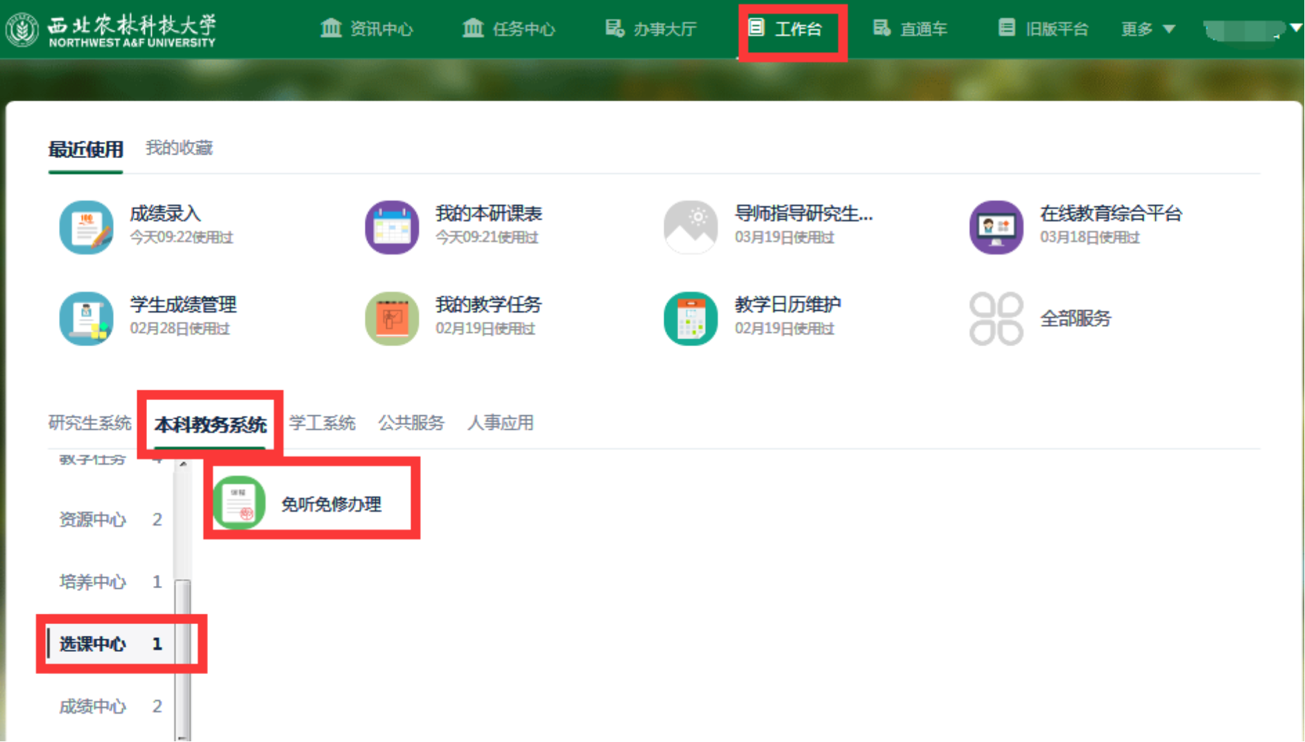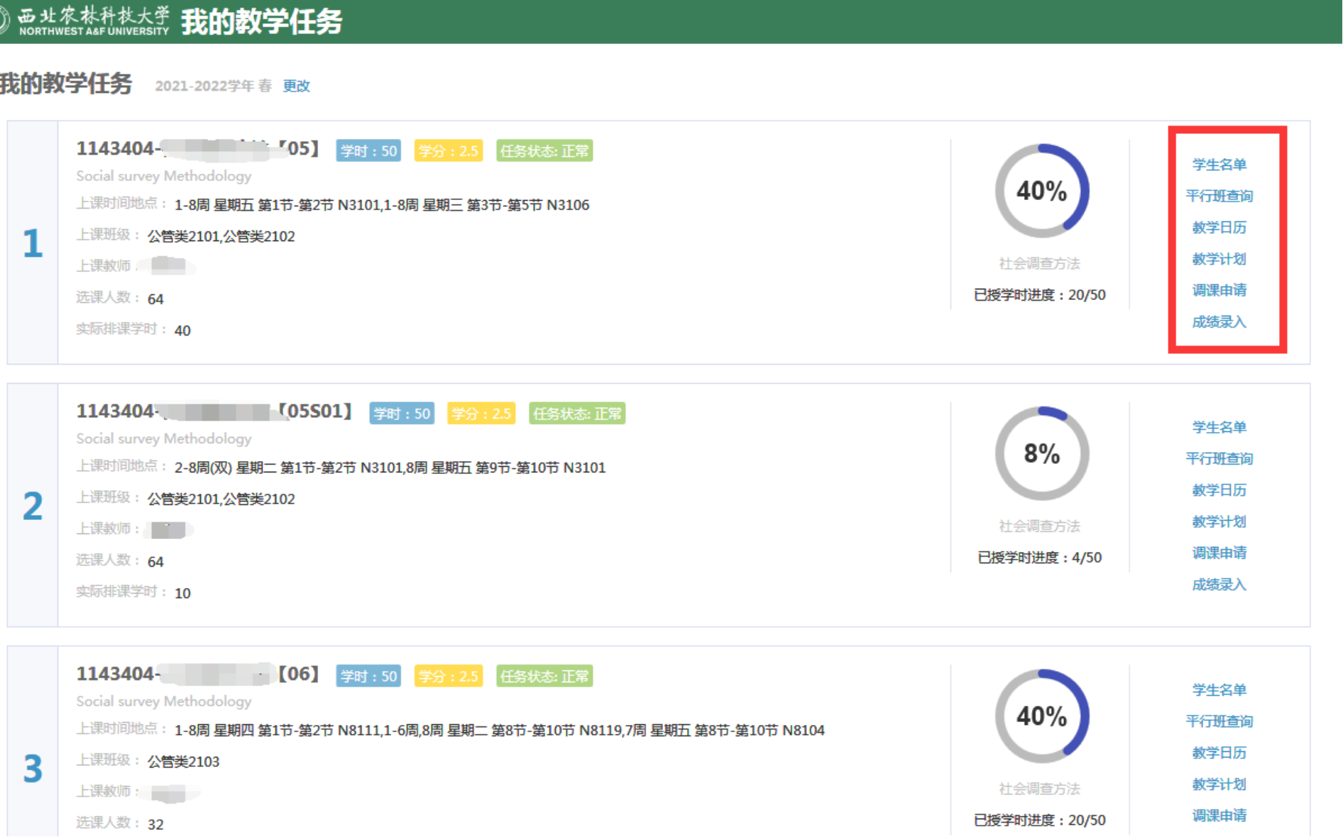 教师打印考核表、考勤表、录入成绩、查询全校课表、教学日历维护、成绩变更、查看评教结果、学生免听免修审核操作截图(要注意最上方学年学期的选择)