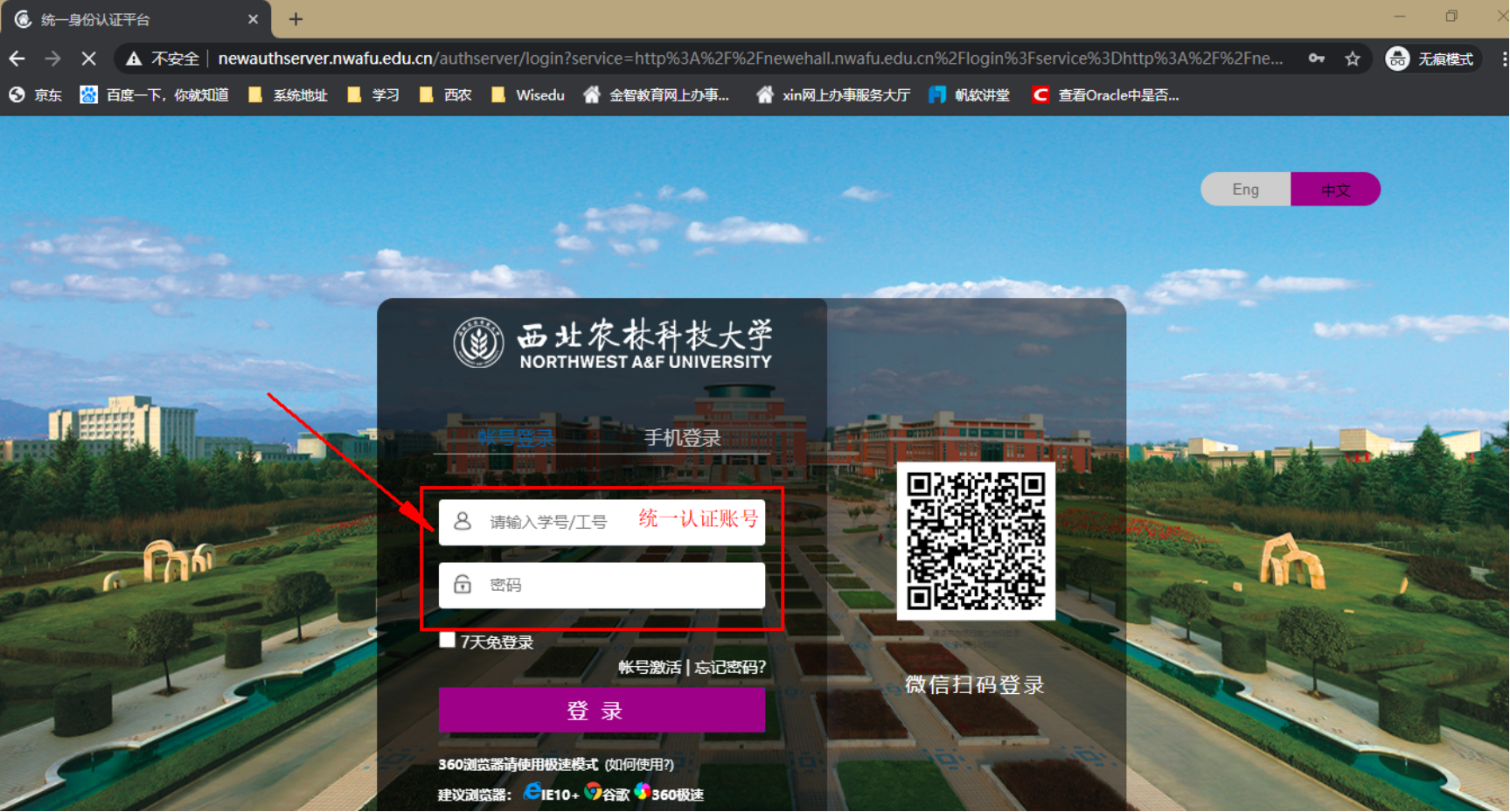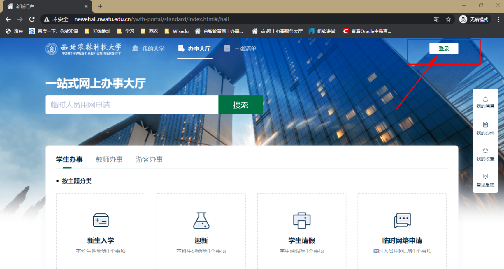 打开浏览器访问新教务系统(地址:http://newehall.nwafu.edu.cn/) 点击右上角的登录,跳转到认证页面,请使用自己的学校统一认证账号和密码进行验证登录。