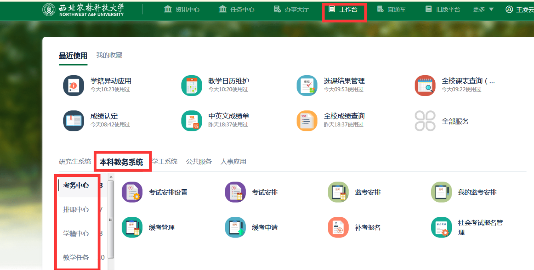 登录成功后,点击页面上侧“工作台”,左下角的“本科教务管理系统”,左侧选择‘教学任务’分类。