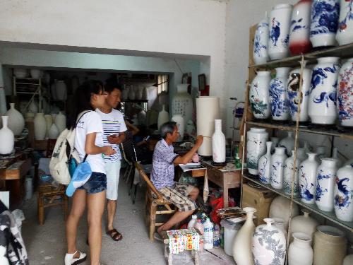 在这家作坊里,我们可以看到完整的陶瓷生产工序,模种、吹釉、做坯、注浆等一样不少,它将最基础的陶瓷制作与经营融为一体,当志愿者问到对制作过程的问题时,店家的小孩向志愿者们解释起来。景德镇的陶瓷文化已潜移默化地植根到一代又一代人心中,这正是老厂能在各方陶瓷产业创新发展的潮流中保存下来的原因。